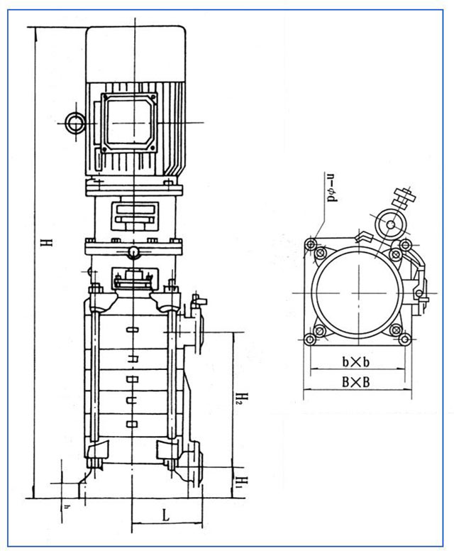 3. 泵与底座安装有两种方式,一种是直接装在水泥基础上的刚性连接,另一种是采用JGD型减振器安装的柔性连接,具体方法见安装示意图所示.